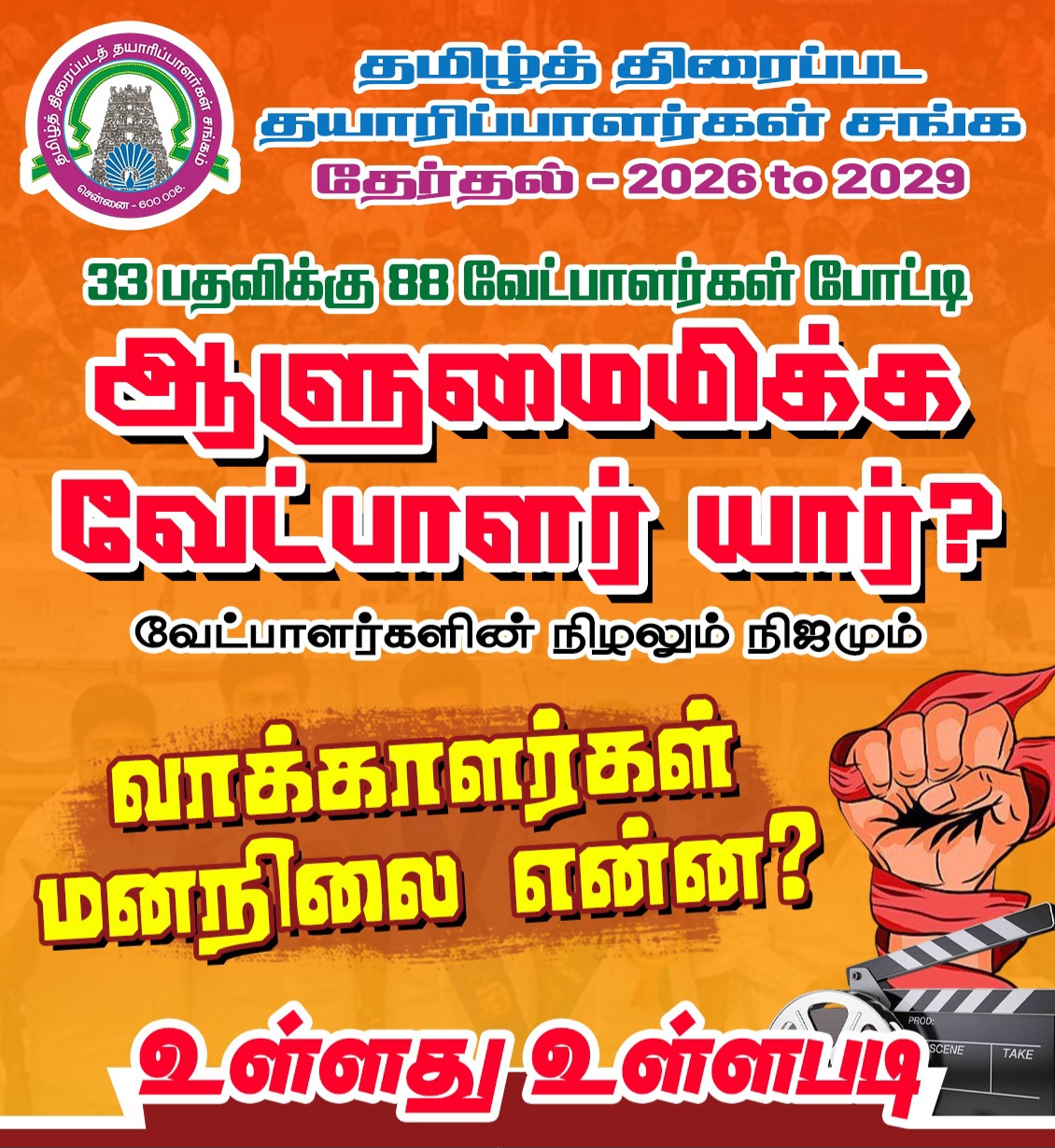 தமிழ்த் திரைப்பட ,தமிழ்நாடு சட்டமன்ற உறுப்பினர்களை தேர்ந்தெடுப்பதற்கான தேர்தல் எதிர்வரும் ஏப்ரல் – மே மாதங்களில் நடைபெறவுள்ளது. அதற்காக பிரதான அரசியல் கட்சிகள் கூட்டணி அமைக்கும் முயற்சிகள் இறுதிக்கட்டத்தை எட்டியுள்ளன. அதற்காக நடைபெற்ற, நடைபெற்று வரும் இட ஒதுக்கீடு, கரன்சி பேரங்கள் என களை கட்டும் சட்டமன்ற தேர்தலுக்கு இணையாக “தமிழ்த் திரைப்பட தயாரிப்பாளர்கள் சங்க நிர்வாகிகளுக்கான தேர்தல்” எதிர்வரும் பிப்ரவரி 22 ஆம் தேதி நடைபெறவுள்ளன.